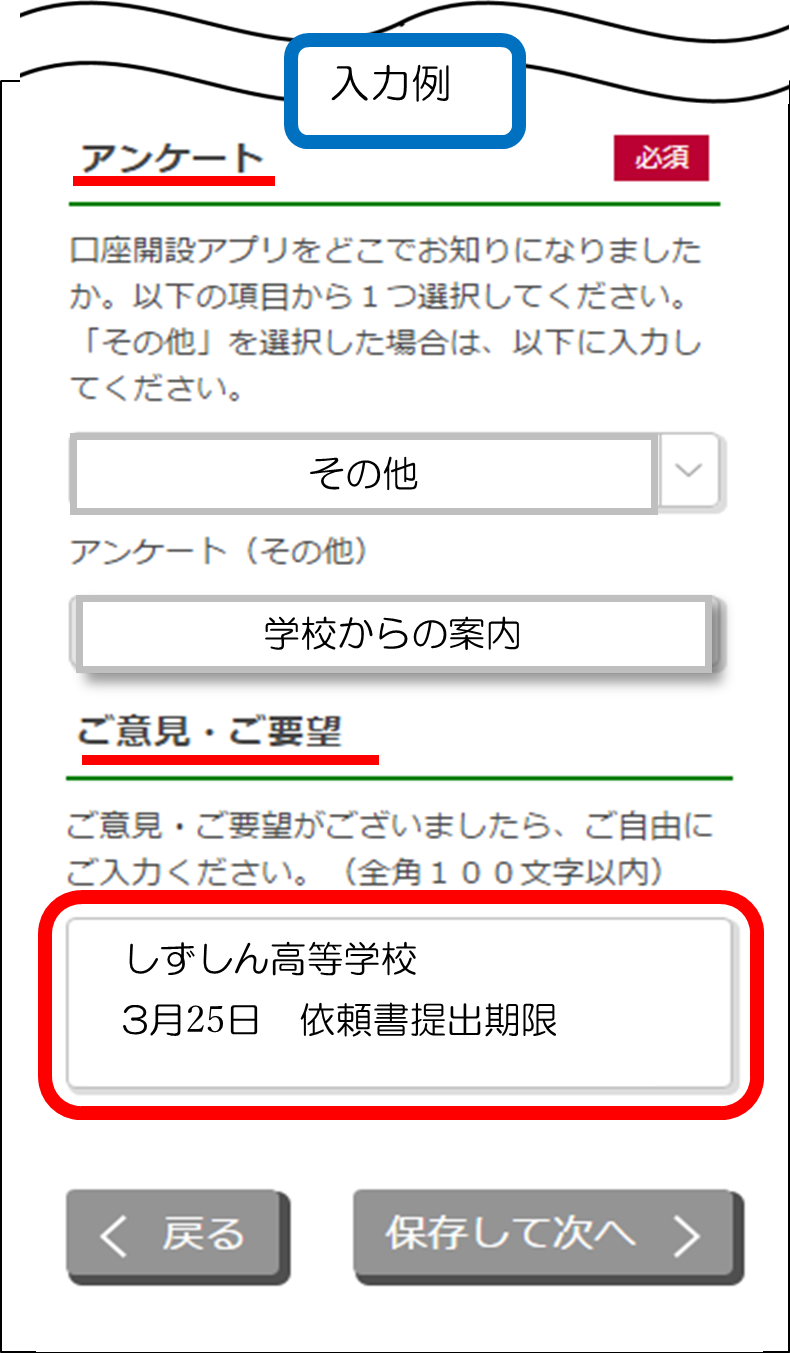 | ※学費振替・給与受取等で口座開設をご希望のお客様へ スマートフォンでの口座開設であっても、お客様が口座をご利用になれる(口座振替依頼書の照合含め※)までに2~3週間程度お時間を頂戴しております。(キャッシュカードをお受取りいただいたところで、口座番号がわかります) 口座振替依頼書など、学校等への提出期限がある場合には、期日を十分ご確認のうえ、日数に余裕をもってお申し込みください。 また、口座開設申し込みの際に、「学校名等」「依頼書等提出期限」を「ご意見・ご要望欄」にご入力ください。ご入力がない場合には、口座開設前に確認のお電話をさせていただきます。 ※口座振替依頼書の照合は、一部の学校を除き、しずおか焼津信用金庫の窓口でのお手続きとなります。 学校または勤務先等への提出期限が近いお客様は、しずおか焼津信用金庫の店舗のあるお店(窓口)での口座開設をご検討ください。店舗での口座開設では、当日に口座番号がわかり、口座振替依頼書の照合も同時に行えます。 |