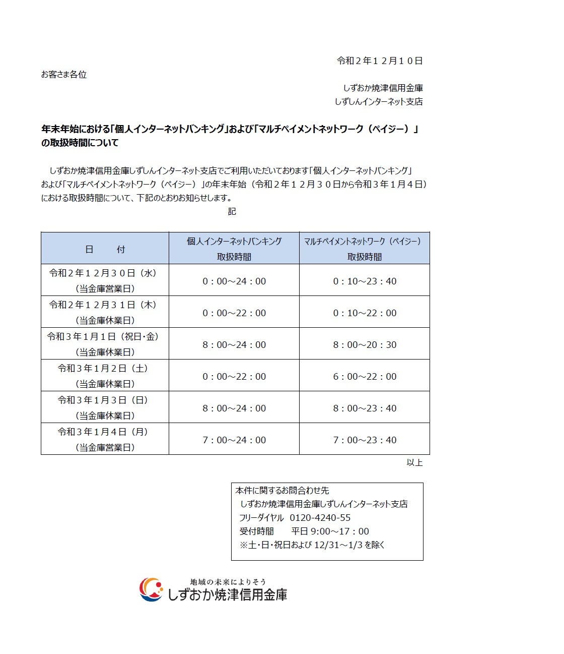 ホーム > 新着情報 > 年末年始における「個人インターネットバンキング」および「マルチペイメントネットワーク(ペイジー)」の取扱時間について [印刷ボタン機能]JavaScript推奨 年末年始における「個人インターネットバンキング」および「マルチペイメントネットワーク(ペイジー)」の取扱時間について