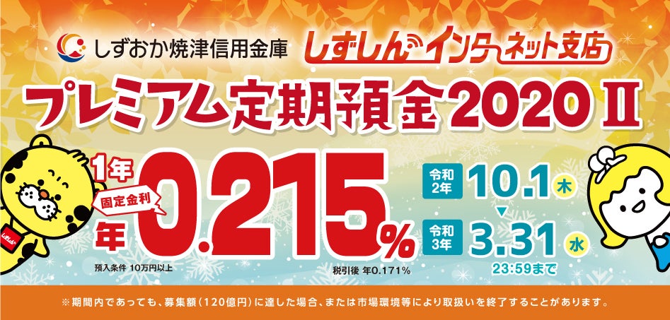 令和2年10月1日(木)0:00から令和3年3月31日(水)23:59まで、しずしんインターネット支店限定「プレミアム定期預金2020Ⅱ(1年)」を販売いたします。くわしい商品内容は、以下のバナーをクリックし、商品概要説明書をご確認ください。