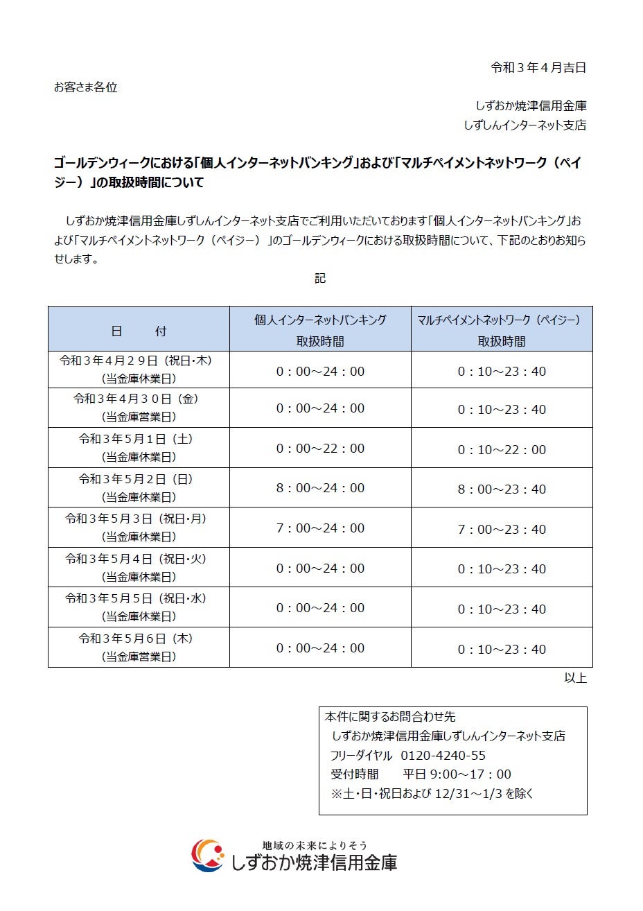 ゴールデンウィークにおける「個人インターネットバンキング」および「マルチペイメントネットワーク(ペイジー)」の取扱時間について