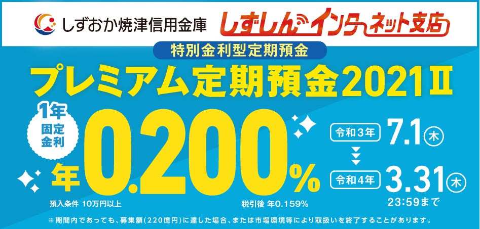 しずしんインターネット支店では、令和3年7月1日(木)の0時00分から新たに特別金利型定期預金「プレミアム定期預金2021Ⅱ(1年)」を発売します。