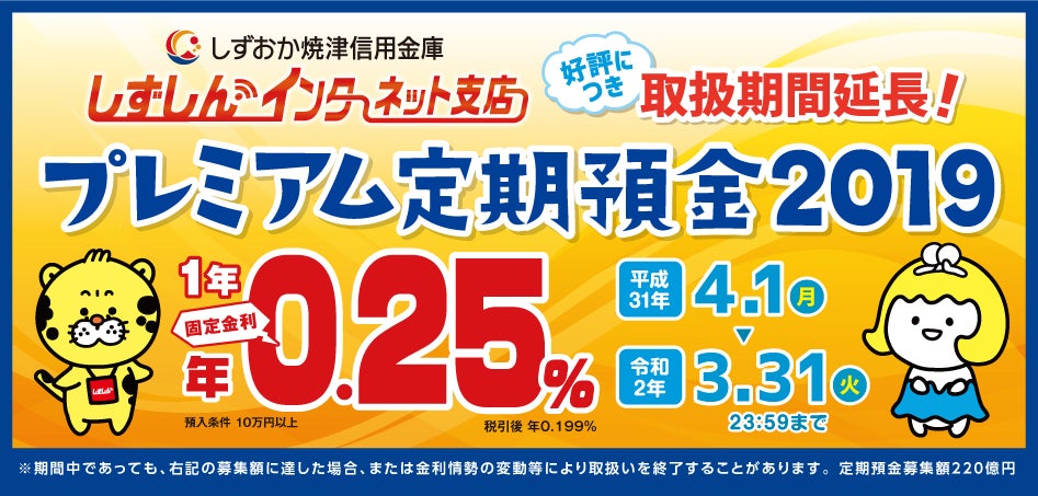 しずしんインターネット支店限定「プレミアム定期預金2019(1年)」募集額増額について