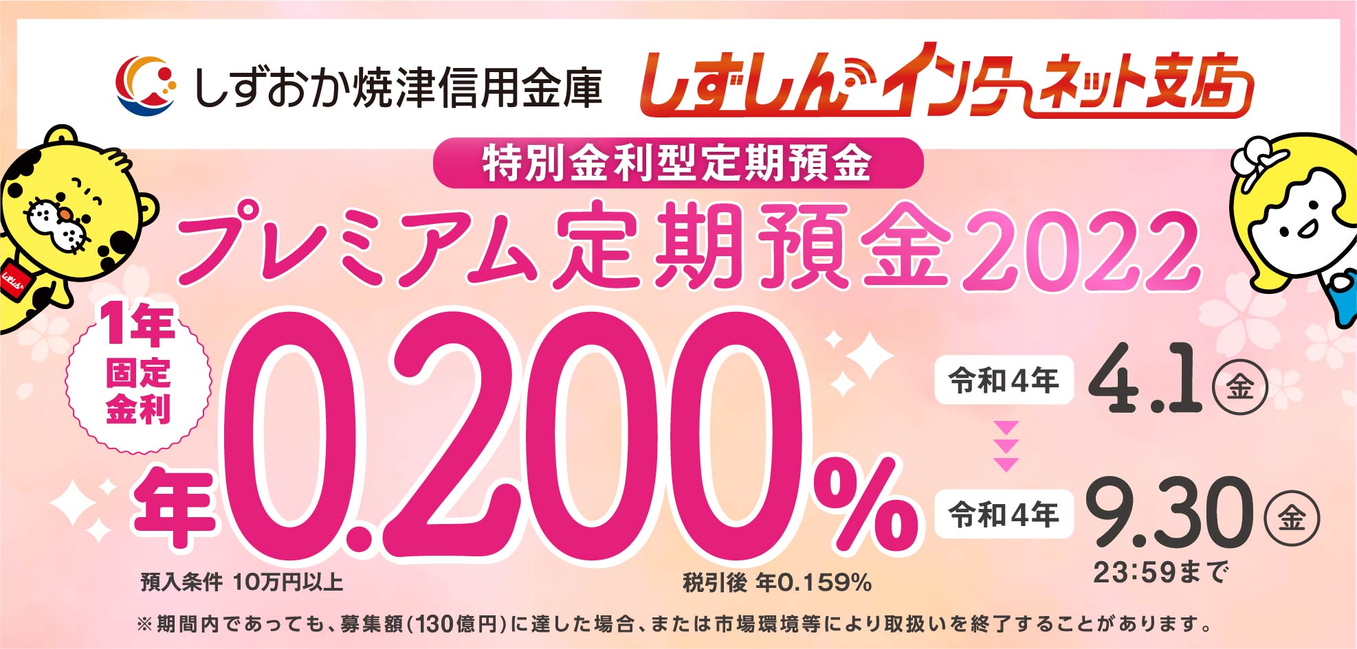令和4年4月1日(金)0:00から令和4年9月30日(金)23:59まで、しずしんインターネット支店限定「特別金利型定期預金プレミアム定期預金2022(1年)」を販売いたします。くわしい商品内容は、以下のバナーをクリックし、商品概要説明書をご確認ください。