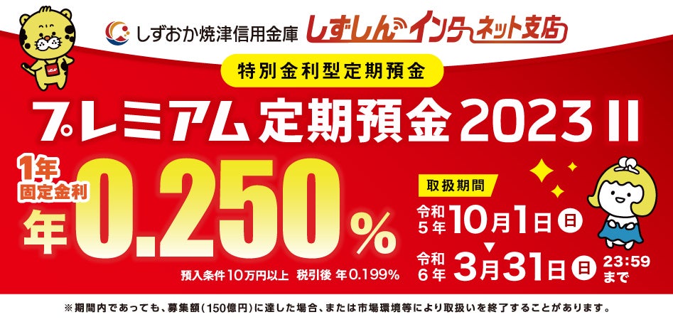 令和5年10月1日(日)8:00から令和6年3月31日(日)23:59まで、しずしんインターネット支店限定「特別金利型定期預金プレミアム定期預金2023Ⅱ(1年)」を販売いたします。くわしい商品内容は、以下のバナーをクリックし、商品概要説明書をご確認ください。