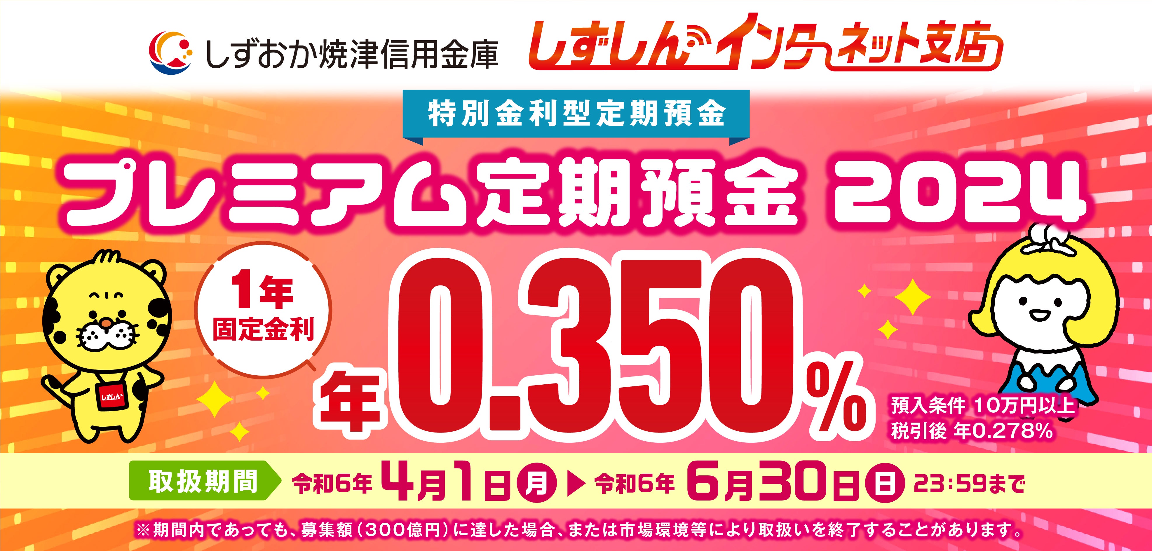 令和6年4月1日(月)7:00から令和6年6月30日(日)23:59まで、しずしんインターネット支店限定「特別金利型定期預金プレミアム定期預金2024(1年)」を販売いたします。くわしい商品内容は、以下のバナーをクリックし、商品概要説明書をご確認ください。