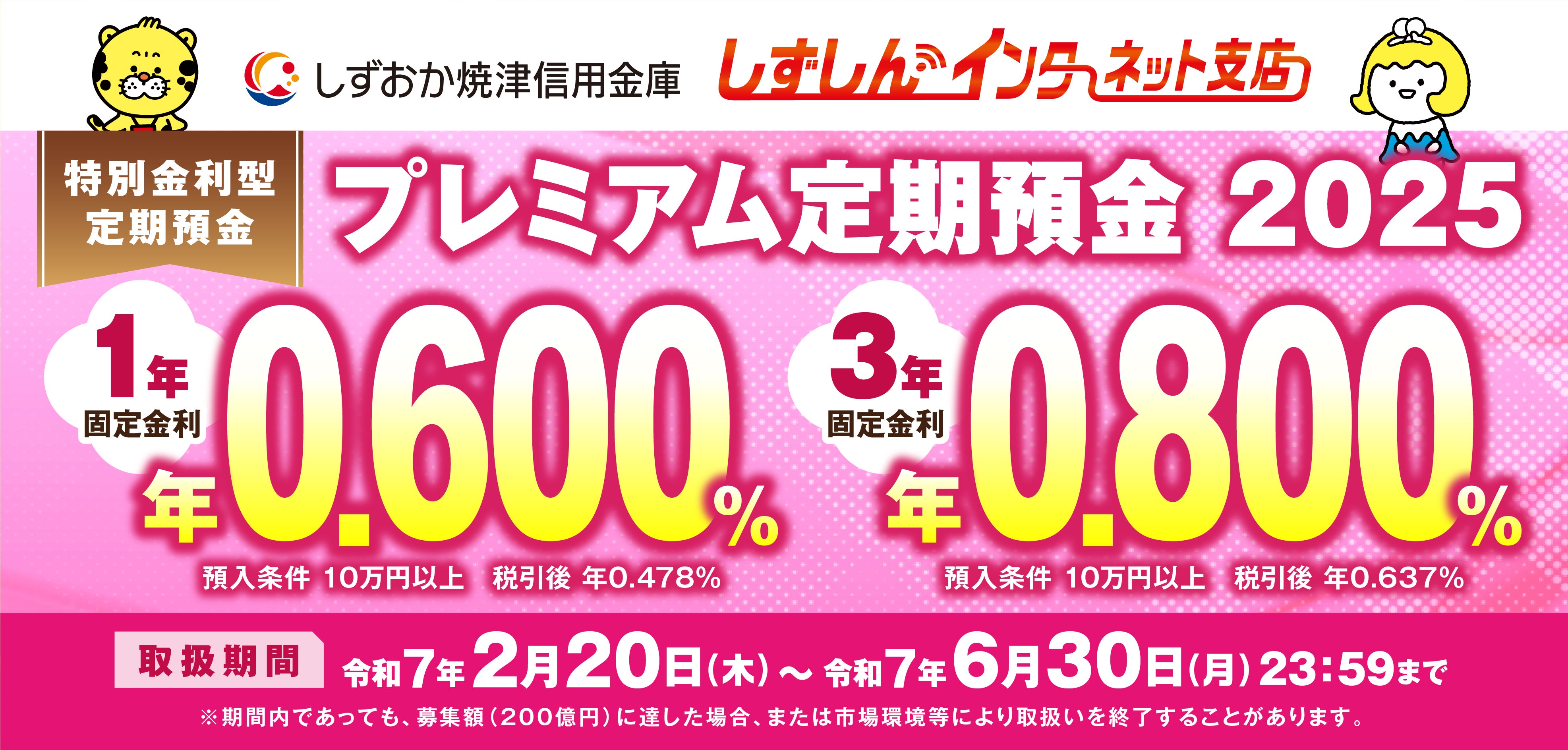 令和7年2月20日(木)より、しずしんインターネット支店限定「プレミアム定期預金2025(1年・3年)」を販売いたします。