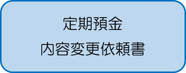 | 定期預金内容変更依頼書 | ⑥定期預金の「予約解約」の解除(取り消し) | 定期預金を「予約解約」すると、満期日に自動解約となります。 誤って「予約解約」してしまった場合など、この手続きをすることにより「予約解約」を取消し、「中途解約」の操作ができる状態となります。 |