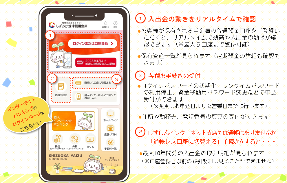 ※「投信インターネットサービス」「外貨インターネットサービス」「借りる」など、しずしんインターネット支店の口座ではご利用できないものもあります